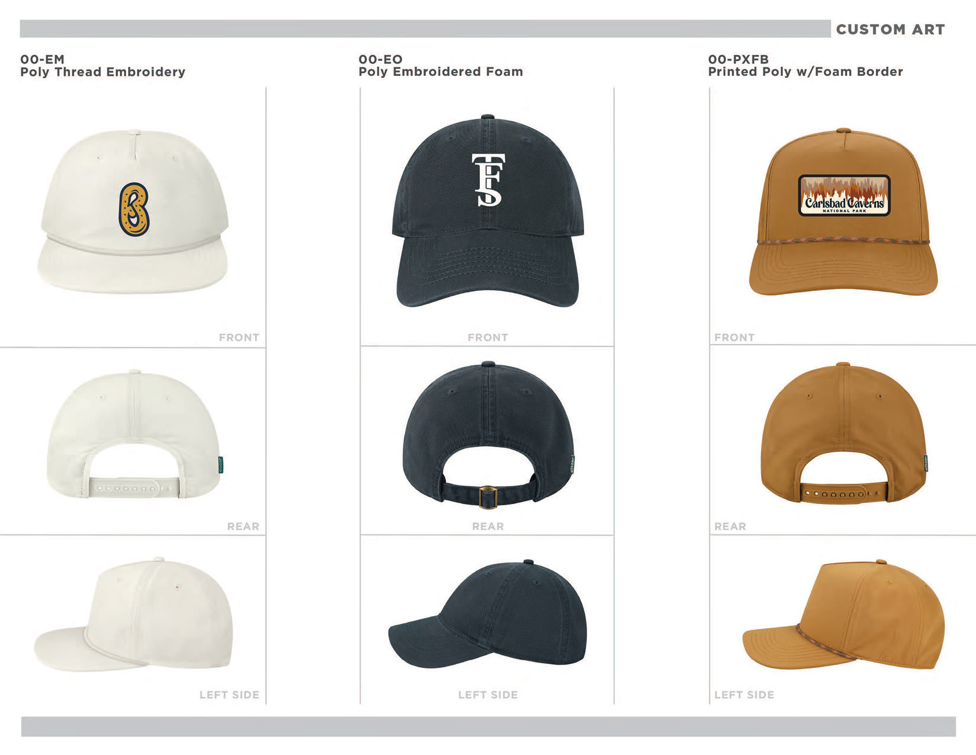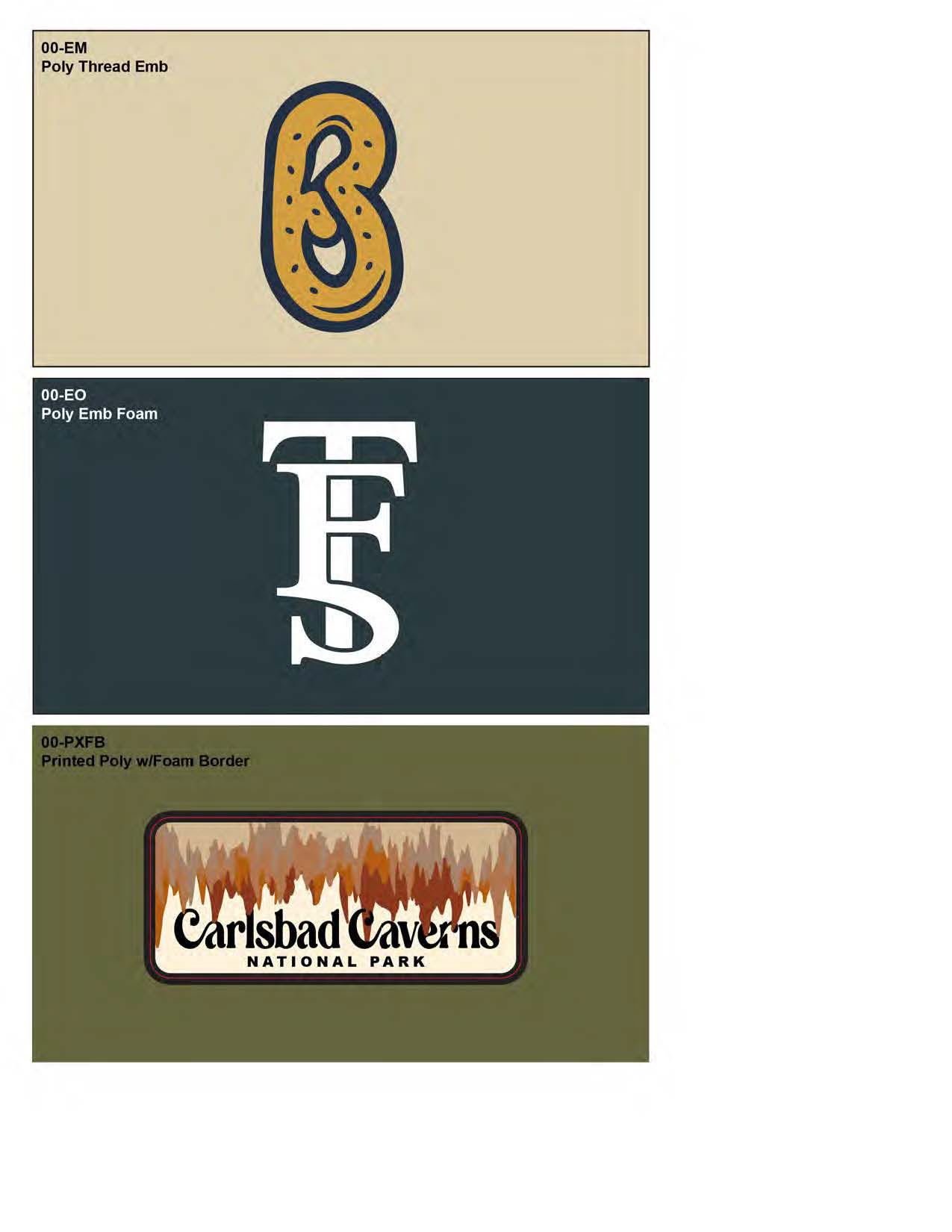 A few of the Custom Art designs I have created at L2 Brands. The first design is Poly Thread Embroidery application of a Pretzel in Navy and Gold Poly Threads. The second design is a Poly Embroidered Foam application with a custom white TFS logo. The third design is a Printed Poly Patch with a black Foam Border.